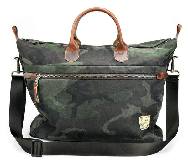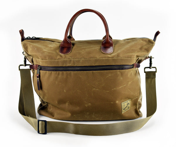 The Carry All Bag features a waxed canvas exterior with leather trim and antique brass zippers and hardware. Large exterior zipper compartment on the front face and fully lined interior with a padded laptop sleeve. 3 small interior slip pockets for cell phone, eyeglasses, pens, etc. Adjustable shoulder strap with antique brass hardware. 1.5" removable, adjustable shoulder strap.