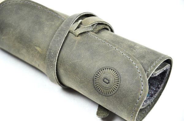 Our leather and felt tool wrap keeps things organized when you're on the go. Great for charging cords, earbuds, sunglasses, etc. Interior felt pocket and 3 leather loops adjust to accommodate a variety of items securely. 5 oz. Field Leather, antique brass snaps, wool felt. 13.5" x 6.75" when laid flat. Made in USA.