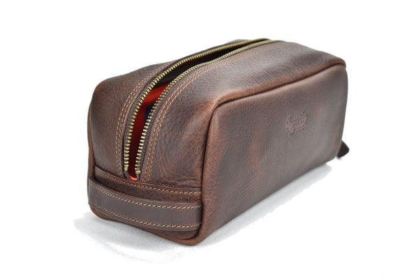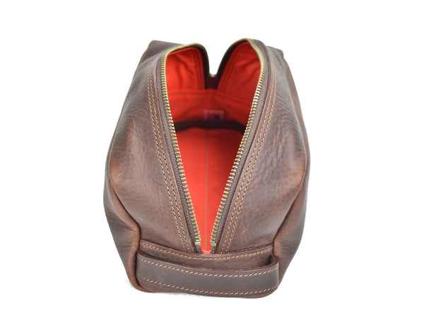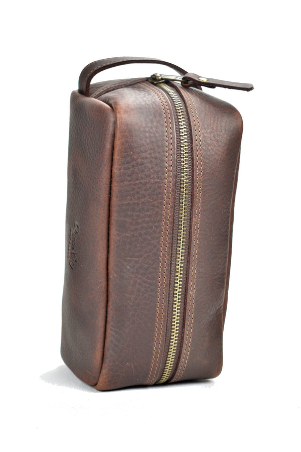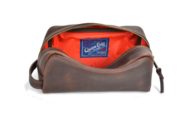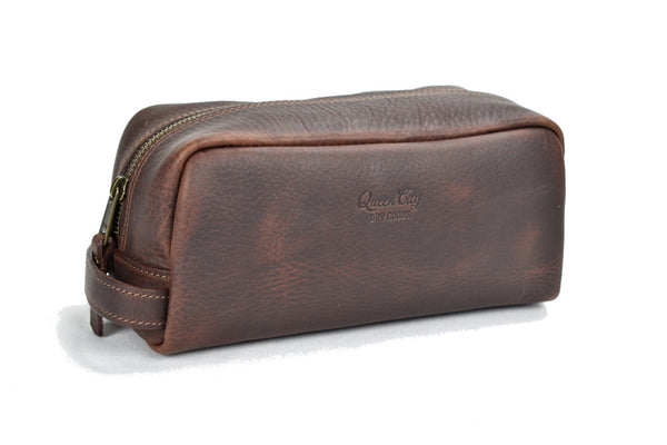 The QCDG Dopp Kit is our take on the classic dopp kit for your travel needs. Made with our chocolate Saddle leather and lined with 400 denier coated nylon for easy cleaning. antique brass metal zipper and leather handle. Made in USA.