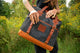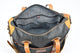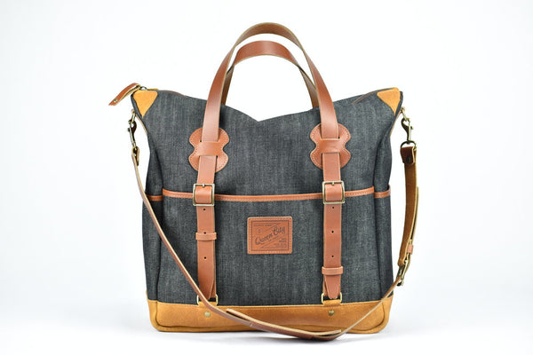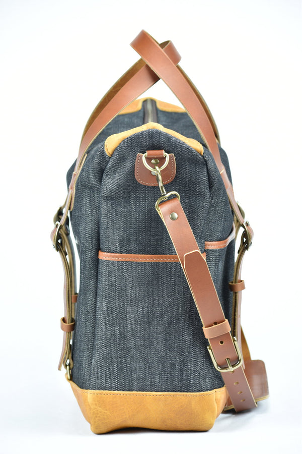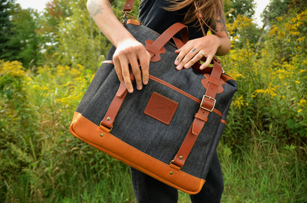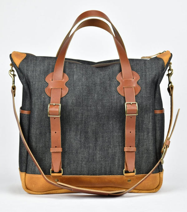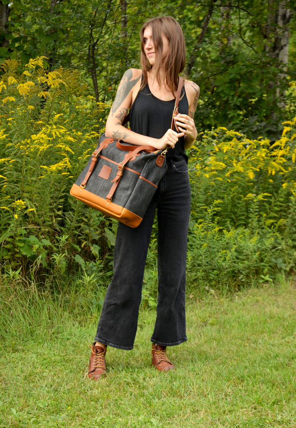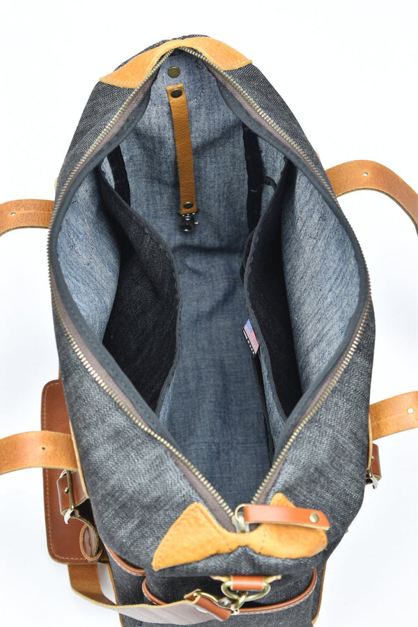 Our classic Vermonter bag made in black denim from Cone Denim's US mill. Trimmed with sturdy 7 oz harness leather and lined with blue cotton canvas. Antique brass hardware with zipper closure, 2 side pockets and one large exterior front slip pocket. Inside there are 2 large slip pockets, 3 small slip pockets for smaller items and a key clasp for easy access to your keys. The handles are fully adjustable from 11.5" drop to 6.5" drop, and comes with adjustable leather shoulder strap. Measures 14" wide x 6" deep x 14" tall. Made in USA.