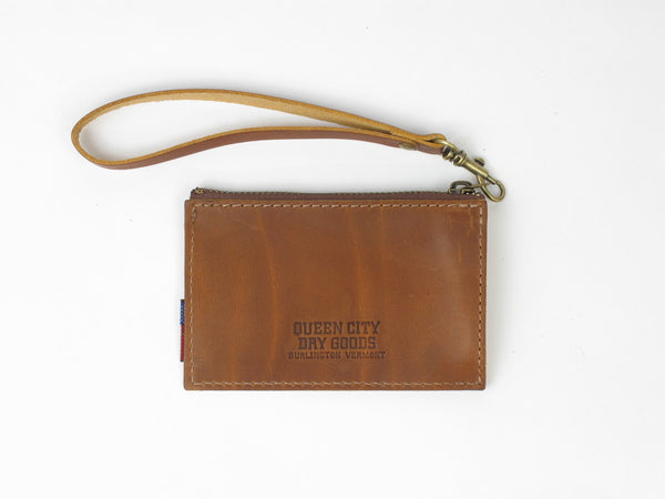 All leather zip top pouch for cards, coins and valuables. Features leather wristlet, 4 oz Field Leather and antique brass zipper. Made in USA.