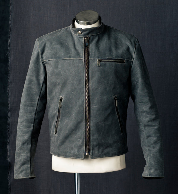 Our take on the classic moto racer style in 16 oz waxed cotton twill. Lined in 100% US herringbone wool and taffeta sleeves. 3 zip pockets on the exterior and 1 large interior zip pocket. We use a heavy #10 zipper for the main closure and all the exterior zippers are antiqued brass. The cuffs open with waterproof gusset for ease of entry and zip close. Antique brass collar snap. Leather collar and cuff linings. Made in USA.