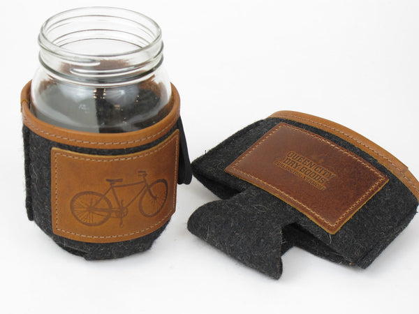 Made for people on the move. Our wool felt and leather ball jar jacket insulates and protects you hands from hot contents. Stamped with the Wright Brothers Van Cleve bicycle. Hang loop for storage. Fits wide mouth and classic ball jars. Priced each. Made in USA.